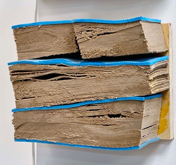 reclaimed paperboard and foam mounted on plywood, 12” tall x 9” wide x 4” deep